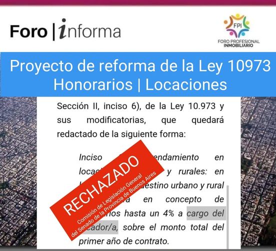 La Comisión de Legislación General del Senado de la Provincia de Buenos Aires, rechazó el proyecto de reforma de la Ley 10973 presentado por el Senador Francisco Durañona (FPV), que pretendía modificar nuestros Honorarios en las Locaciones.