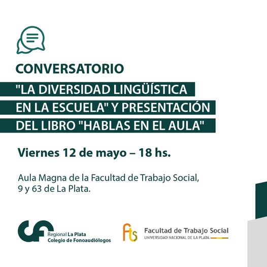 Te invitamos al Conversatorio «La diversidad lingüística en la escuela. Multilingüismo e interculturalidad» y a la presentación del libro «Hablas en el aula» a cargo de la Prof. Gladys Lopreto el próximo 12 de mayo a las 18 hs. en el aula magna de la Facultad de Trabajo Social, calle 9 y 63 de La Plata.