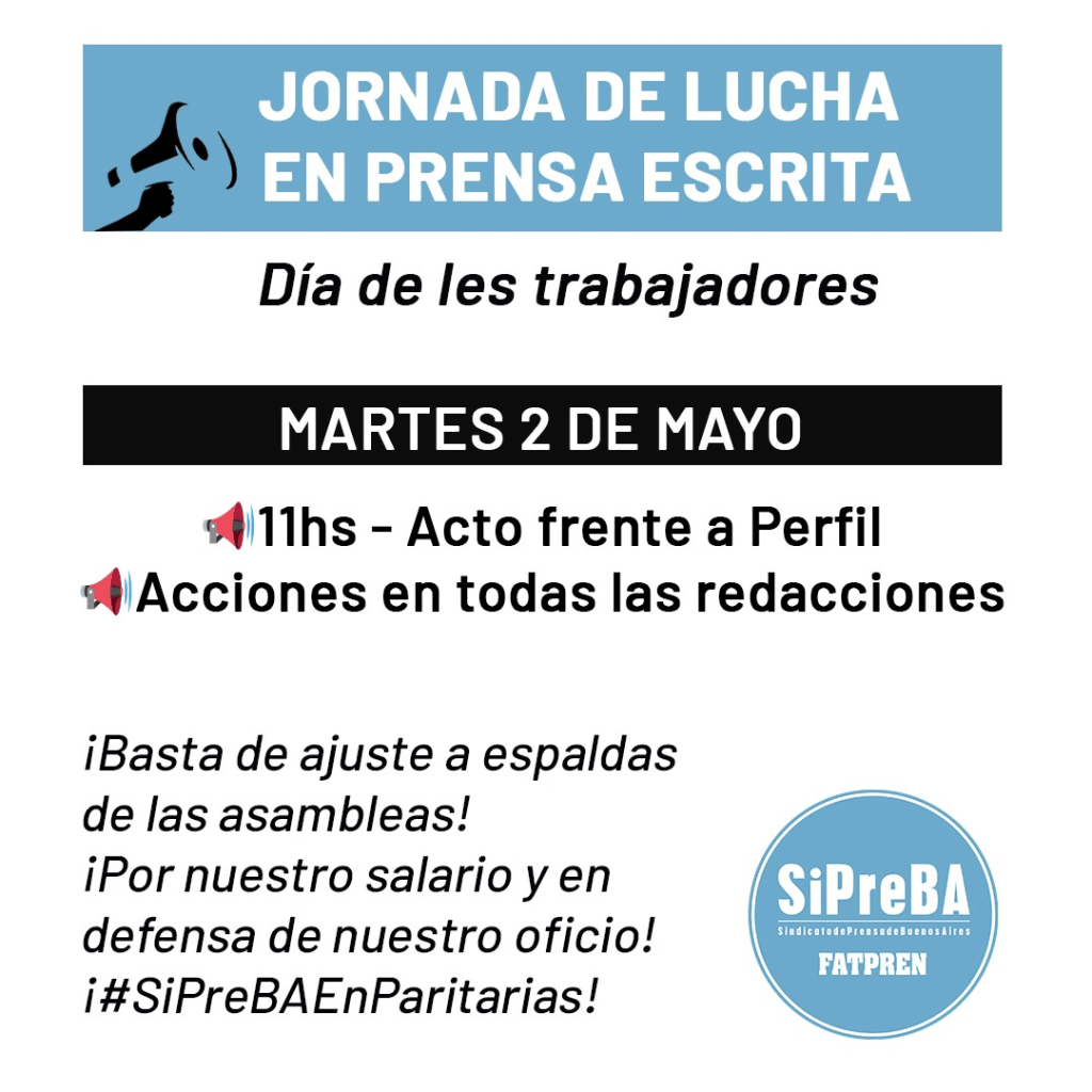 Ante la exclusión forzada de la mesa paritaria de nuestro sindicato por un recurso judicial presentado por Utpba y el cierre de un nuevo acuerdo paritario ilegítimo en prensa escrita, desde el SiPreBA convocamos para este martes 2 de mayo a realizar una jornada de lucha salarial en todos los diarios impresos y online, revistas, portales web y agencias de noticias de la Ciudad de Buenos Aires, en repudio a un ajuste que profundiza el deterioro salarial.