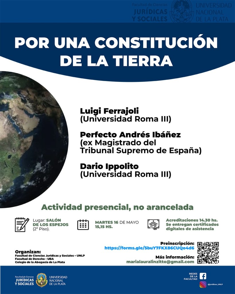 La Facultad de Ciencias Jurídicas y Sociales de la Universidad Nacional de La Plata, junto a la Facultad de Derecho de la Universidad de Buenos Aires y el Colegio de la Abogacía de La Plata invitan a participar de la Charla “Por una Constitución de la Tierra”, la cual se llevará a cabo de manera presencial el martes 16 de mayo, en el horario de 15:15 hs. a 20:00 hs. en el Salón de los Espejos (2º piso, Edificio de la Reforma Universitaria).