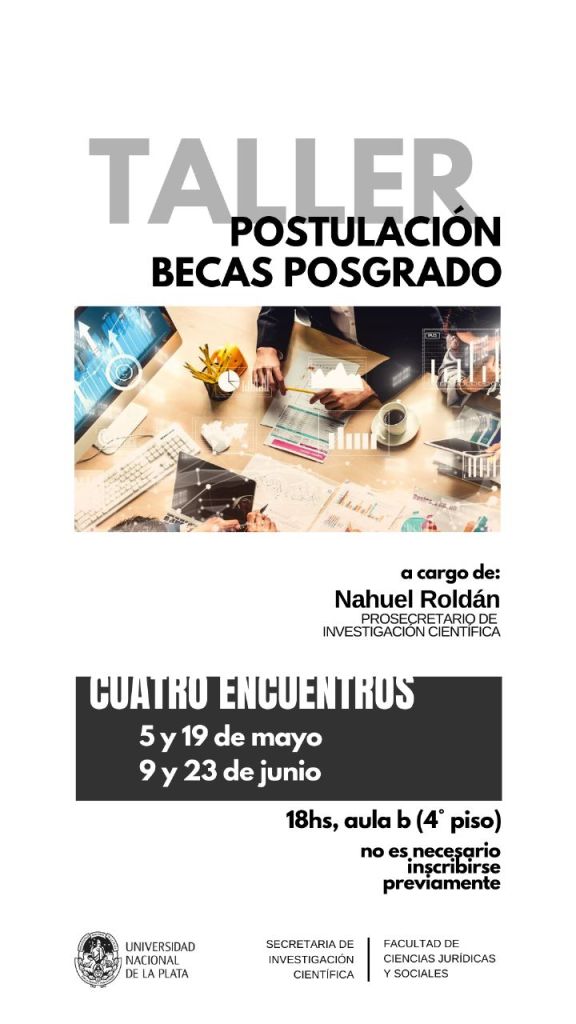 «La secretaria de investigación científica de la FCJYS de la UNLP, convoca a estudiantes que deseen presentarse a becas de postgrado. Para lo cual se dictaran cuatro talleres con la finalidad de acompañar a lo/así postulantes en el diseño de su proyecto de investigación».