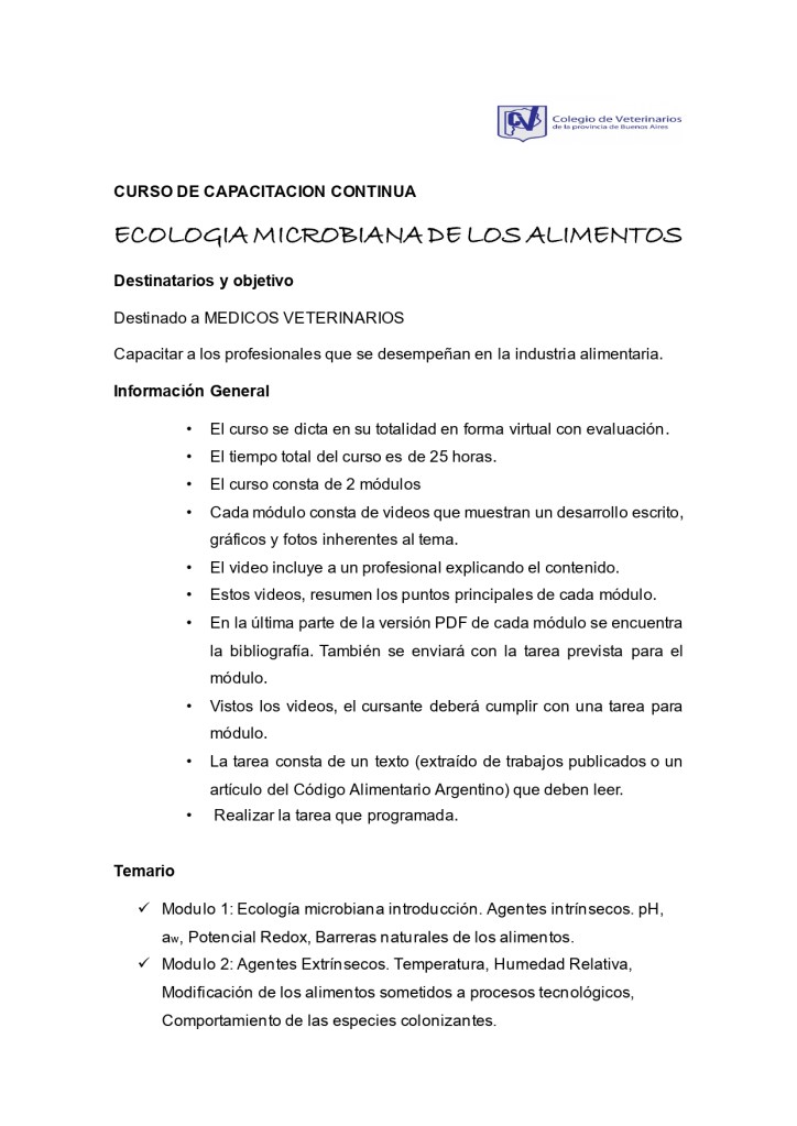 La comisión de Inocuidad Alimentaria del CVPBA, encabezada por el Dr. Héctor Baschar, se encuentra organizando el curso «Ecología Microbiana de los alimentos».