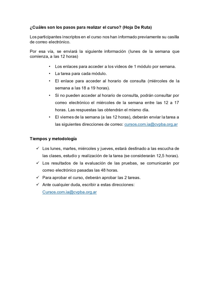 Esta capacitación será de carácter virtual y su inscripción se realiza mediante un mail a cursos.com.ia@cvpba.org.ar, ya que los cupos son limitados. La duración del mismo será de 25 horas totales, distribuidas en dos semanas.
