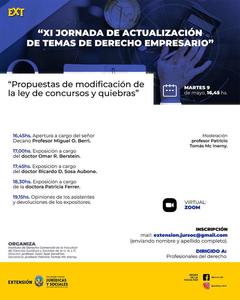 La Secretaría de Extensión Universitaria invita a participar de la XI Jornada de actualización de temas de Derecho empresario que se desarrollará sobre «Propuestas de modificación de la Ley de concursos y quiebras”, organizada por el Instituto de Derecho Comercial de la Facultad de Ciencias Jurídicas y Sociales de la Universidad Nacional de La Plata, la cual se llevará a cabo el día martes 9 de mayo a las 16:45 hs. por Plataforma Zoom.