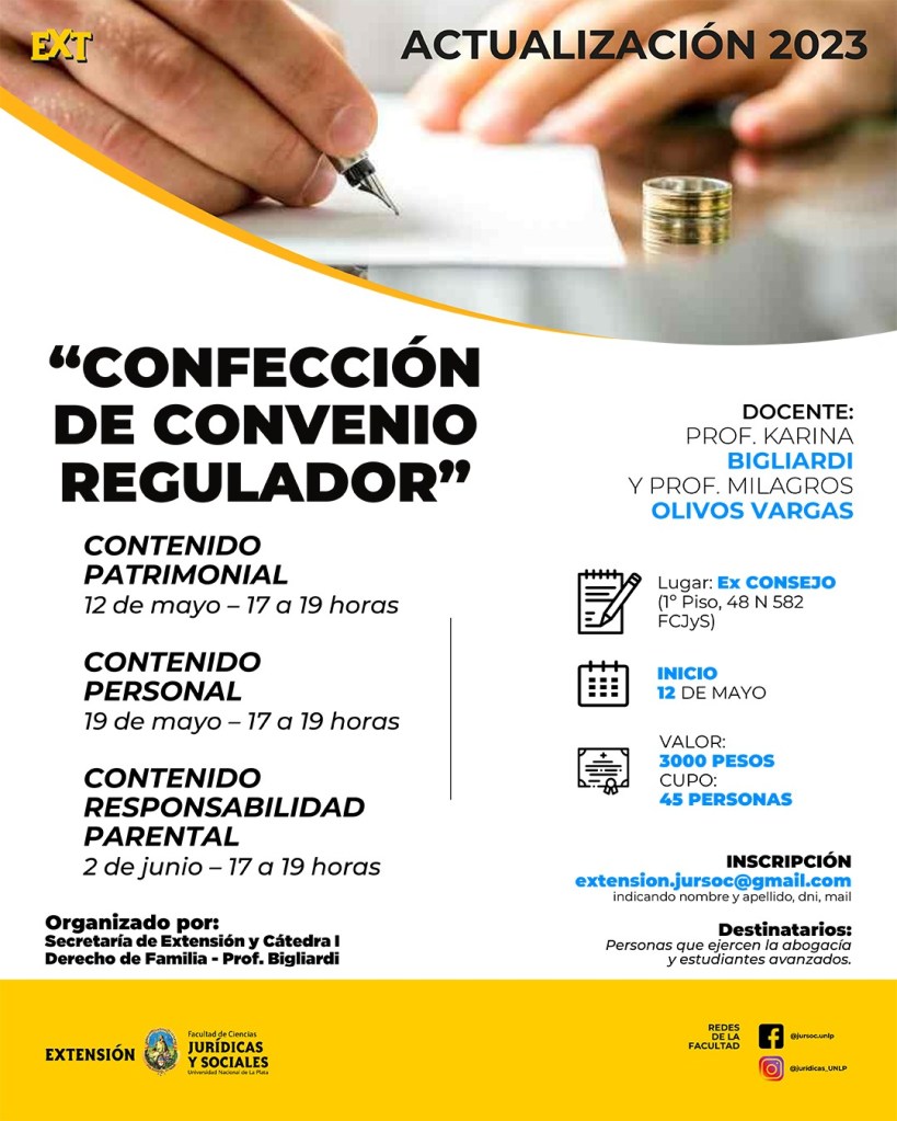 La Secretaria de Extensión Universitaria invita a participar del “CURSO CONFECCIÓN DE CONVENIO REGULADOR «, organizado por esta Secretaría y la Cátedra I Derecho de Familia – Prof. Bigliardi, el cual se dictará de manera presencial los días viernes 12, 19 de mayo y 2 de junio de 2023 de 17 a 20 hs.