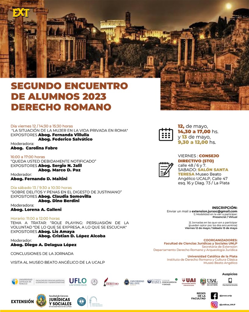 La Secretaría de Extensión invita a participar del “Segundo Encuentro de alumnos 2023 – Derecho Romano” , organizado por esta Secretaría de Extensión y el Departamento de Derecho Romano y Arqueología Jurídica de la Facultad de Ciencias Jurídicas y Sociales de la Universidad Nacional de La Plata, junto con el Instituto de Derecho Romano y Cultura Clásica, y el Museo Beato Angélico, de la Universidad Católica de La Plata.