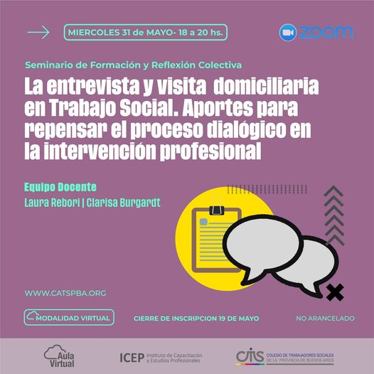 La presente propuesta está orientada a matriculadxs del CATSPBA con la finalidad de promover la reflexión y análisis sobre el proceso dialógico de la entrevista y visita domiciliaria como elementos táctico operativos en el marco de los procesos de intervención profesional.