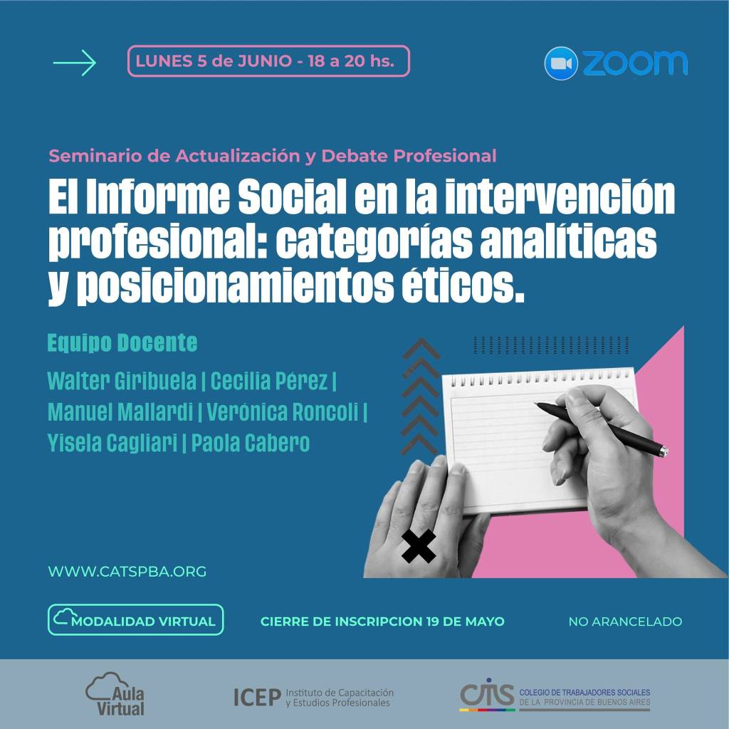 Partiendo de entender al Informe Social como género discursivo y como intervención propiamente dicha en Trabajo Social, el presente seminario de actualización y debate profesional tiene como objetivo generar espacios de problematización de las configuraciones subyacentes en torno a la elaboración de Informes Sociales, siendo la población destinataria les matriculades del CATSPBA. En este sentido, comprender que las narrativas de la intervención profesional se encuentran atravesadas por determinaciones propias del posicionamiento ético-político de cada profesional, así como también a los propios condicionamientos de cada espacio socio-ocupacional en el que dichas prácticas se enmarcan.