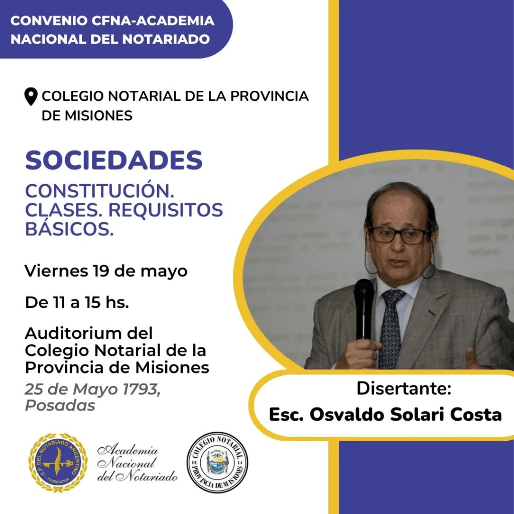 El Esc. Osvaldo Solari Costa capacitará sobre «Sociedades. Constitución. Clases. Requisitos básicos.» Será en el Colegio Notarial de la Provincia de Misiones.