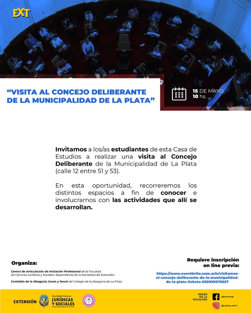 Desde el Centro de Articulación de Iniciación Profesional de la Facultad de Ciencias Jurídicas y Sociales, dependiente de la Secretaría de Extensión,en coordinación con el Colegio de la Abogacía de La Plata (CALP), invitamos a los/as alumnos/as de esta Casa de Estudios a realizar una visita al Concejo Deliberante de la Municipalidad de La Plata (calle 12 entre 51 y 53), el día lunes 15 de mayo de 2023 a las 10hs. En esta oportunidad, recorreremos los distintos espacios a fin de conocer e involucrarnos con las actividades que allí se desarrollan.