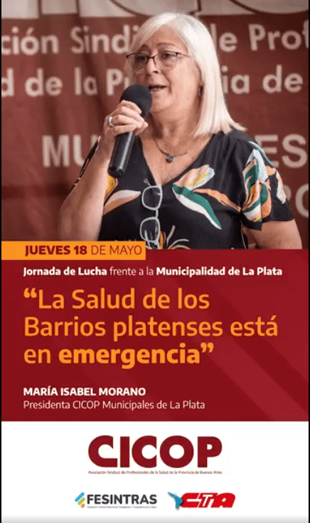 La titular de CICOP Municipales de La Plata, María Isabel Morano, manifestó que la gestión comunal “ignora a lxs profesionales y técnicxs de la salud que atienden a lxs ciudadanxs platenses en cada uno de los barrios” y reiteró el pedido de reconocimiento de nuestro gremio para debatir las políticas públicas sanitarias que se necesitan a nivel local.