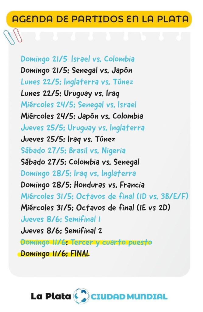 Según el calendario difundido por la FIFA, La Plata no solo será la locación que concentrará la mayor cantidad de partidos a lo largo de la competencia, sino que a su vez albergará los encuentros más relevantes, tales como las semifinales y la gran final.