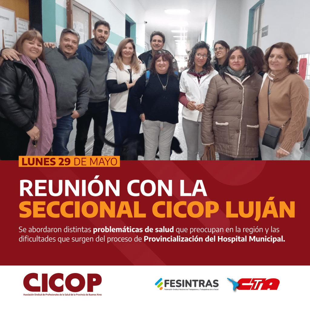 Lxs integrantes del Consejo Directivo de CICOP, Juan Martín Mirada y María Teresa Sosa, compartieron este lunes un encuentro con trabajajadorxs de la salud del Municipio de Luján y del Hospital en proceso de Provincialización junto a la nueva Comisión Directiva del gremio.