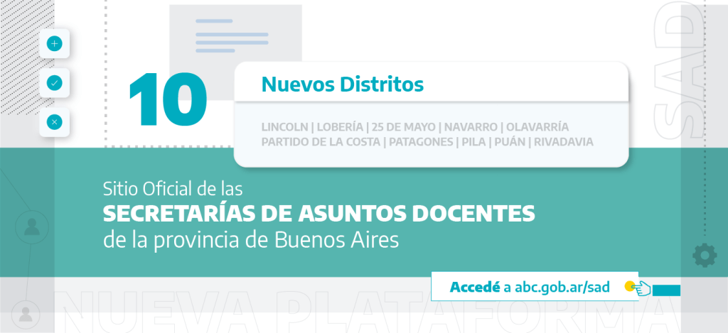 La plataforma de la Secretaría de Asuntos Docentes (SAD) acaba de incorporar los sitios de 10 nuevos distritos lo que permitió elevar a 50 el número de sedes administrativas de la Provincia que ya tienen un espacio propio en el Portal ABC con el objetivo de brindar soluciones a las comunidades educativas y facilitar la comunicación entre el Estado, docentes y aspirantes a la docencia.