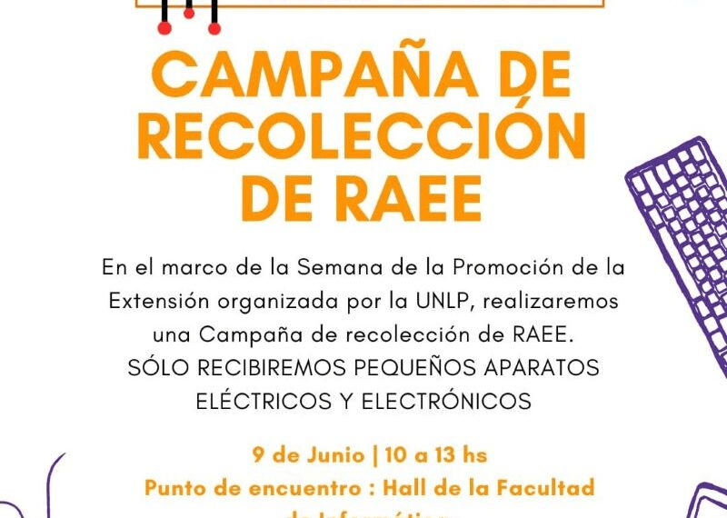 En el marco dela Semana de la Promoción de la Extensión, la Facultad de Informática, de la Universidad Nacional de La Plata, realizará una campaña de recolección de RAEE-Residuos de aparatos eléctricos y electrónicos-, que tendrá lugar el 9 de julio de 10 a 13hs en el hall de esta unidad académica, ubicada en calle 50 y Av. 120.
