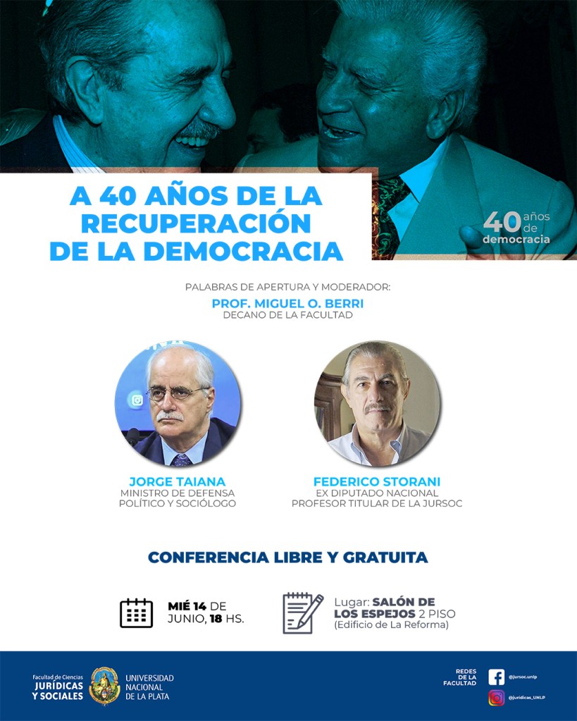 La Facultad de Ciencias Jurídicas y Sociales de la Universidad Nacional de La Plata los/las invita a participar de la Conferencia «A 40 años de la recuperación de la Democracia» , la cual se llevará a cabo el día miércoles 14 de junio del año corriente a las 18 hs, en el Salón de Los Espejos (2° piso Edificio de La Reforma).