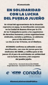 CONADU confirma su adhesión a esta movilización, con cese de tareas para los sindicatos del AMBA, y ratifica para el día jueves 22 el paro de actividades en solidaridad con la lucha docente y del conjunto del pueblo jujeño.