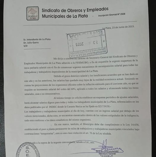 Al mismo tiempo se solicita establecer un esquema periódico de ajustes salariales, hasta alcanzar salarios dignos para todas y todos los trabajadores municipales de La Plata, referenciados en los datos publicados por el INDEC dónde la Canasta Básica Alimentaría hoy es de $217.915- mientras que los salarios que actualmente perciben los trabajadores y trabajadoras municipales dependientes de ese Municipio, se encuentran al límite de la indigencia, conforme los datos estadísticos del mismo Organismo.