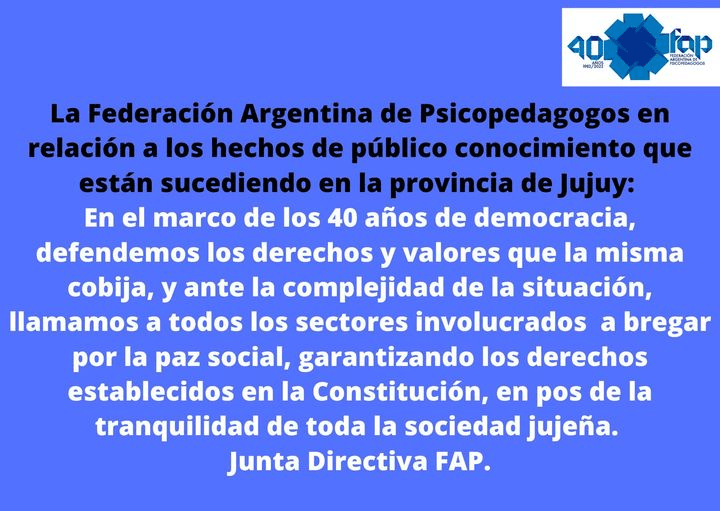 La Federación Argentina de Psicopedagogos en relación a los hechos de público conocimiento que están sucediendo en la provincia de Jujuy, se solidariza con todos/as los/as colegas y la sociedad en general.