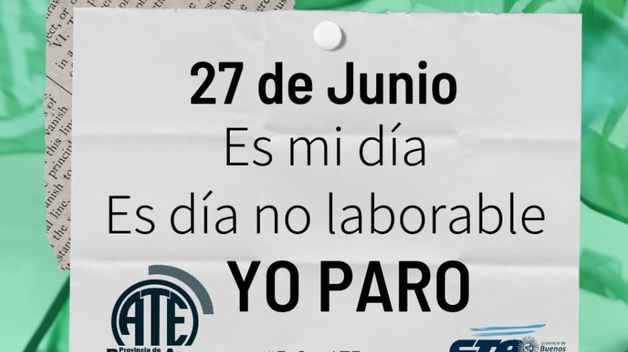 El Consejo Directivo de la provincia de Buenos Aires de ATE notificó al ministerio de Trabajo bonaerense que realizará un paro este martes 27 de junio cuando se celebre el día del trabajador del Estado.
