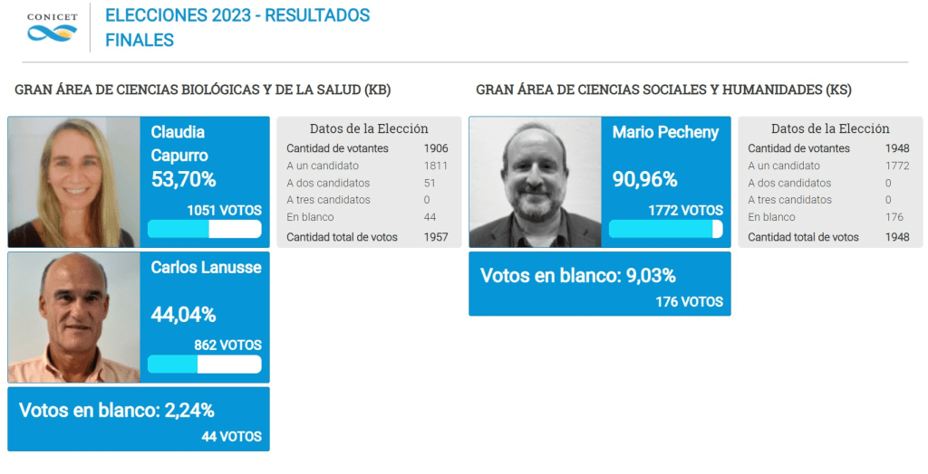 El CONICET informa los resultados de las Elecciones 2023 de integrantes del Directorio de las Grandes Áreas de Ciencias Biológicas y de la Salud y de Ciencias Sociales y Humanidades.