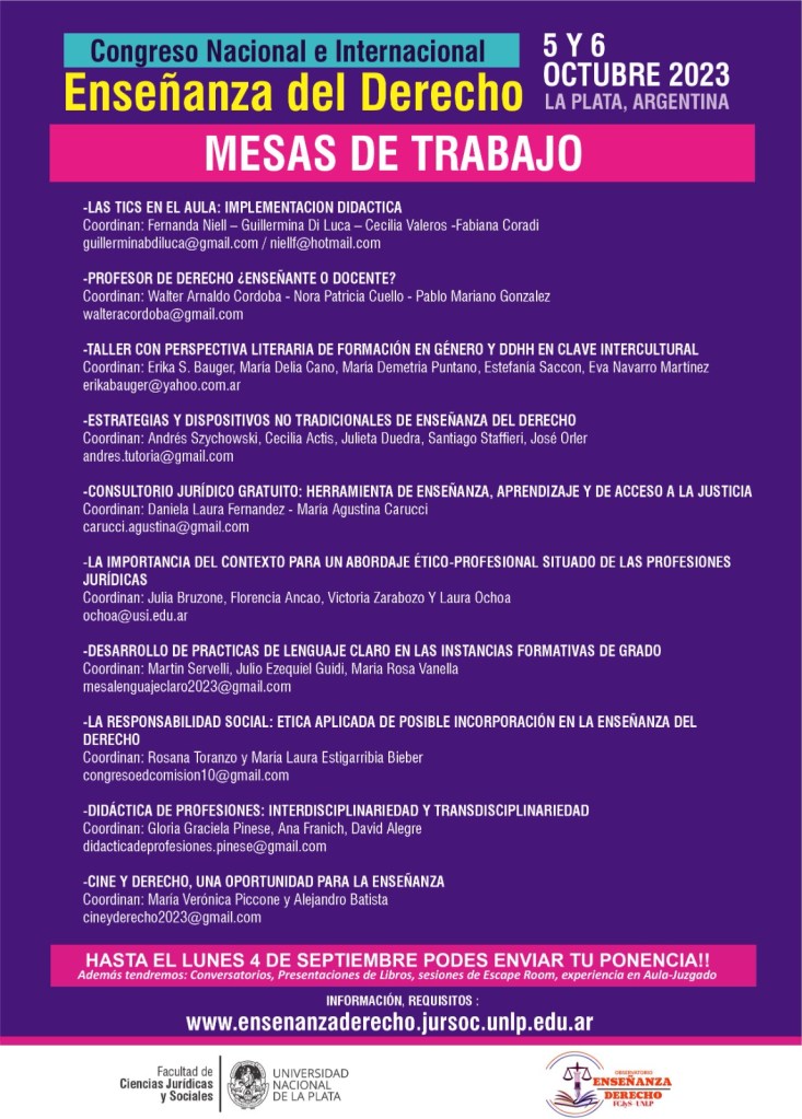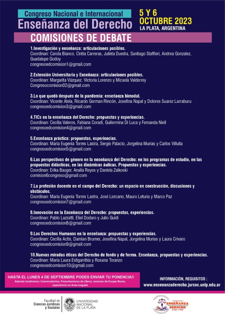 Con 10 Comisiones de Debate, y 10 Mesas de Trabajo Especiales, se llevará adelante los días 5 y 6 de Octubre en nuestra Facultad, el VI Congreso Internacional de Enseñanza del Derecho, con la consigna “Repensar la enseñanza del Derecho después de la pandemia: ¿articulando presencialidad y virtualidad?”