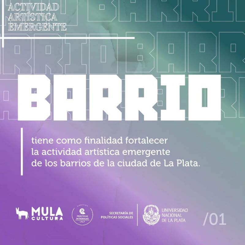 El programa BARRIO, impulsado por la Dirección de Prácticas Integrales de la Secretaría de Políticas Sociales de la Universidad Nacional de La Plata tendrá abierta su inscripción desde el 3 de julio hasta el 3 de agosto. BARRIO tiene como finalidad promover y fortalecer la actividad artística emergente de los barrios de La Plata, Berisso y Ensenada, por medio de un incentivo material y generación de instancias de formación con espacios académicos de la Universidad.