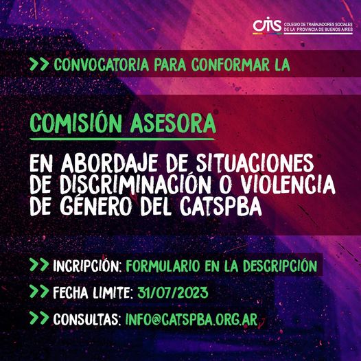 Con el objetivo de garantizar en el CATSPBA un ámbito libre de discriminación, hostigamiento y violencia por razones de género y diversidad sexual, promoviendo condiciones de igualdad y equidad, se realiza una convocatoria abierta a profesionales de Trabajo Social, preferentemente con trayectoria en el abordaje de la temática de violencia en todas sus manifestaciones, interesadas en conformar una Comisión Asesora en abordaje de situaciones de discriminación o violencia de género al interior del CATSPBA.