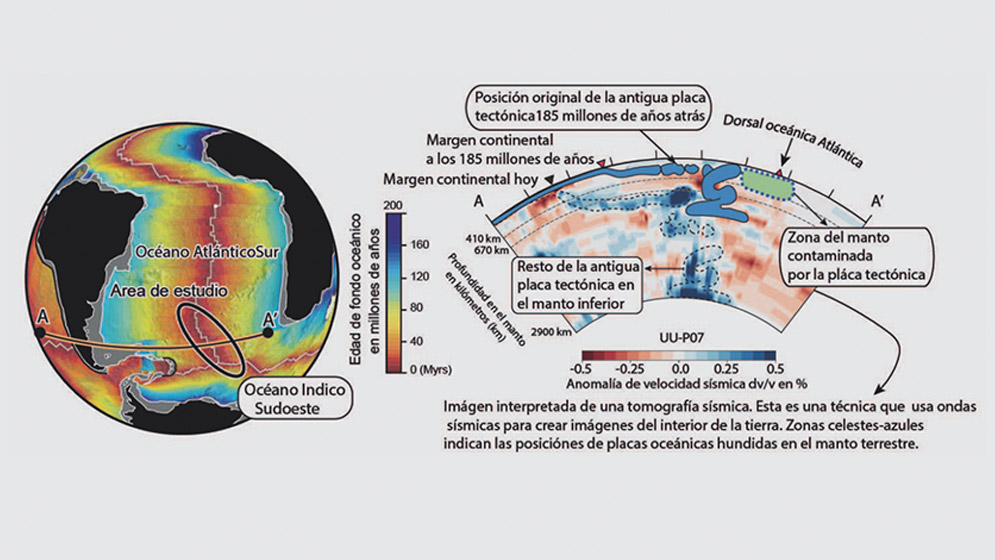 Según comentan los expertos, el hallazgo clave fue detectar que en las inmediaciones del área de estudio existe un gigantesco fragmento de una antigua placa tectónica hundida en el manto hace aproximadamente 300 a 185 millones de años, lo que podría explicar la contaminación del manto circundante. Esto se logró conocer mediante la combinación de tomografías sísmicas, una técnica que permite explorar el manto terrestre, junto con reconstrucciones de placas que ofrecen la posición pasada de las placas tectónicas. Esta placa fósil, hoy en día alojada a profundidades entre los 1800 y 2800 km en el manto inferior, es el vestigio de una antigua zona de subducción que habría estado activa por lo menos hasta hace 180 millones de años atrás, tiempos en los que Sudamérica, África y Antártida permanecían juntos formando parte del gran continente llamado Gondwana”, señala el investigador.