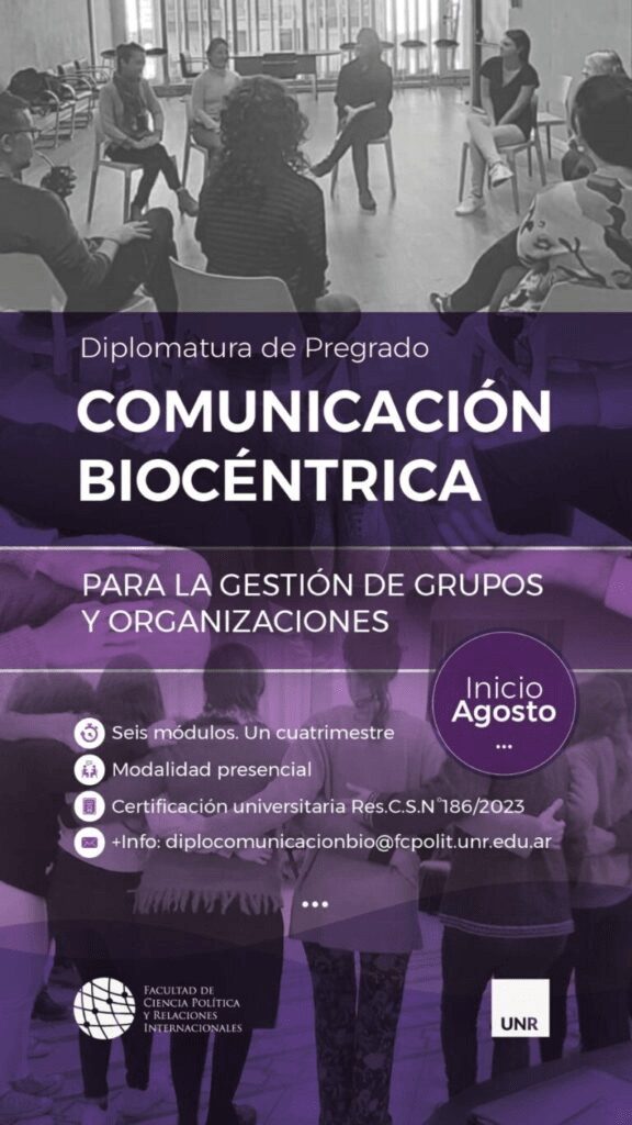 Seis módulos de una jornada y media (Viernes de 10 a 19.30 hs y Sábados de 9 a 13 hs). Con dinámica de taller, desde una pedagogía dialógico-vivencial biocéntrica. En @FCPolitUNR – Rosario.