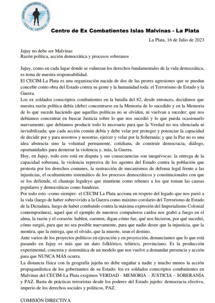 17 julio, 2023 clipurbanodenoticias El CECIM La Plata se pronunció sobre la situación represiva en Jujuy /Fuente: Centro de Ex Combatientes de Islas Malvinas La Plata/ Ccomunicado Comparte esto: Compartir en X (Se abre en una ventana nueva) X Comparte en Facebook (Se abre en una ventana nueva) Facebook Más Compartir en LinkedIn (Se abre en una ventana nueva) LinkedIn Compartir en Tumblr (Se abre en una ventana nueva) Tumblr Haz clic en Pinterest (Se abre en una ventana nueva) Pinterest Compartir en Telegram (Se abre en una ventana nueva) Telegram Compartir en WhatsApp (Se abre en una ventana nueva) WhatsApp Me gusta Cargando...