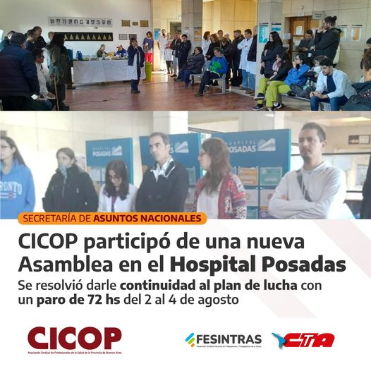 El Consejo Directivo Provincial de CICOP, a través de su Secretaría de Asuntos Nacionales, acompañó el pasado jueves 27 de julio una asamblea en el hall del Hospital Posadas, donde se resolvió continuar con el plan de lucha con un nuevo paro de 72 hs del 2 al 4 de agosto.