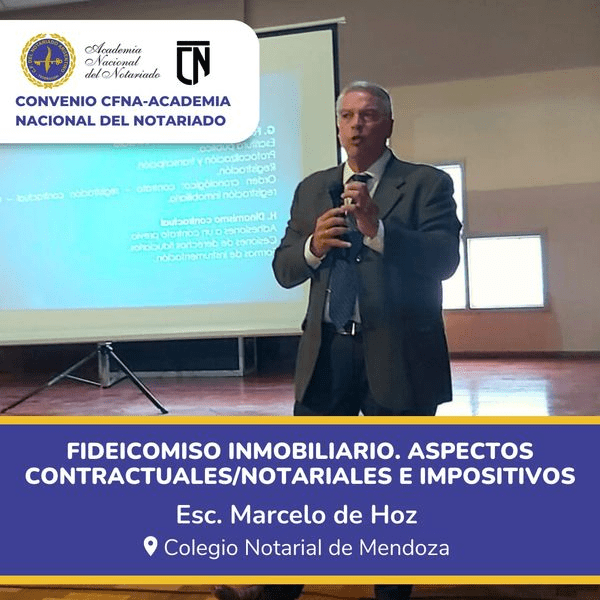 El pasado 28 de julio se llevó a cabo en el Colegio Notarial de Mendoza la capacitación del Esc. Marcelo de Hoz sobre «Fideicomiso inmobiliario. Aspectos contractuales/notariales e impositivos». Fue en el marco del convenio CFNA – Academia Nacional del Notariado, que permite llevar capacitaciones presenciales a las provincias.