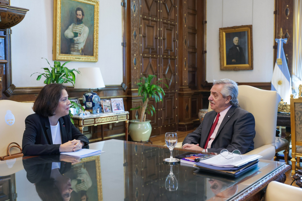 El presidente Alberto Fernández se reunió en Casa Rosada con la embajadora saliente de Francia en la República Argentina, Claudia Scherer-Effosse, la primera mujer en ocupar este cargo diplomático en nuestro país, con quien repasó los principales logros de su gestión, claves para el fortalecimiento de la agenda bilateral.