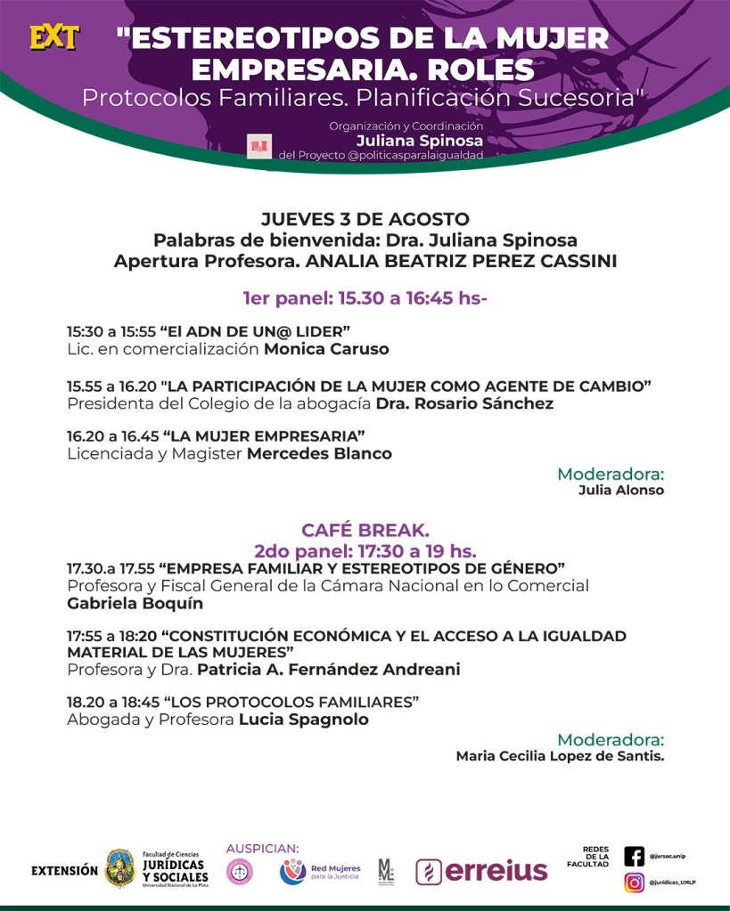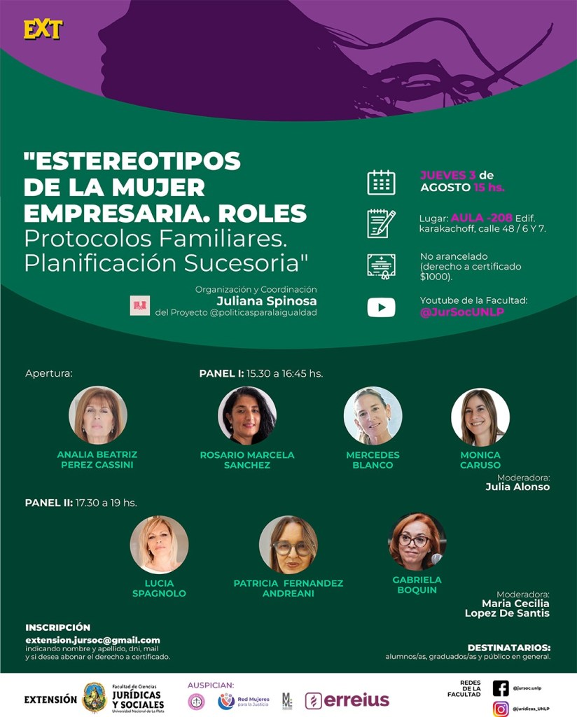 La Secretaría de Extensión Universitaria invita a participar de la Jornada «ESTEREOTIPOS DE LA MUJER EMPRESARIA. ROLES. Protocolos Familiares, Planificación Sucesoria», organizada por el Proyecto “Políticas para la igualdad” (@politicasparalaigualdad) dependiente de esta Secretaría, en conjunto con la Profesora Analía Beatriz Pérez Cassini, titular de Derecho Comercial I de esta casa de estudios, la misma se llevará a cabo el día jueves 3 de agosto en el horario de 15 a 19 hs. en el auditorio (-208 subsuelo), Edificio Sergio Karakachoff.
