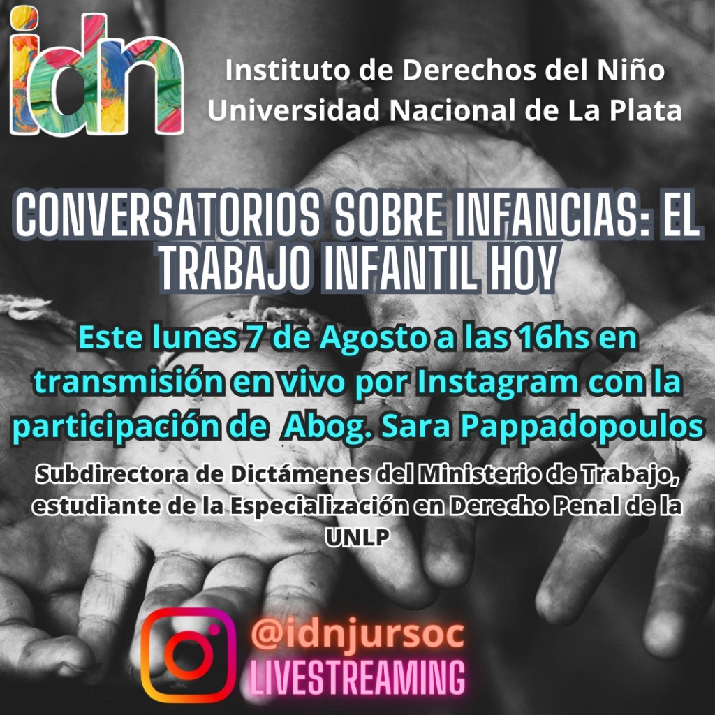 El Instituto de Derechos del Niño invita a participar de los «Conversatorios sobre infancias. El trabajo infantil hoy» que se realizará el lunes 7 de agosto a las 16hs en transmisión en vivo por instagram con la participación de la Abog. Sara Pappadoupoulos.