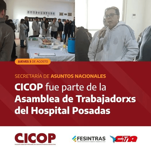 La Secretaría de Asuntos Nacionales de CICOP participó el jueves 3 de agosto de la Asamblea de Trabajadorxs del Hospital Posadas.