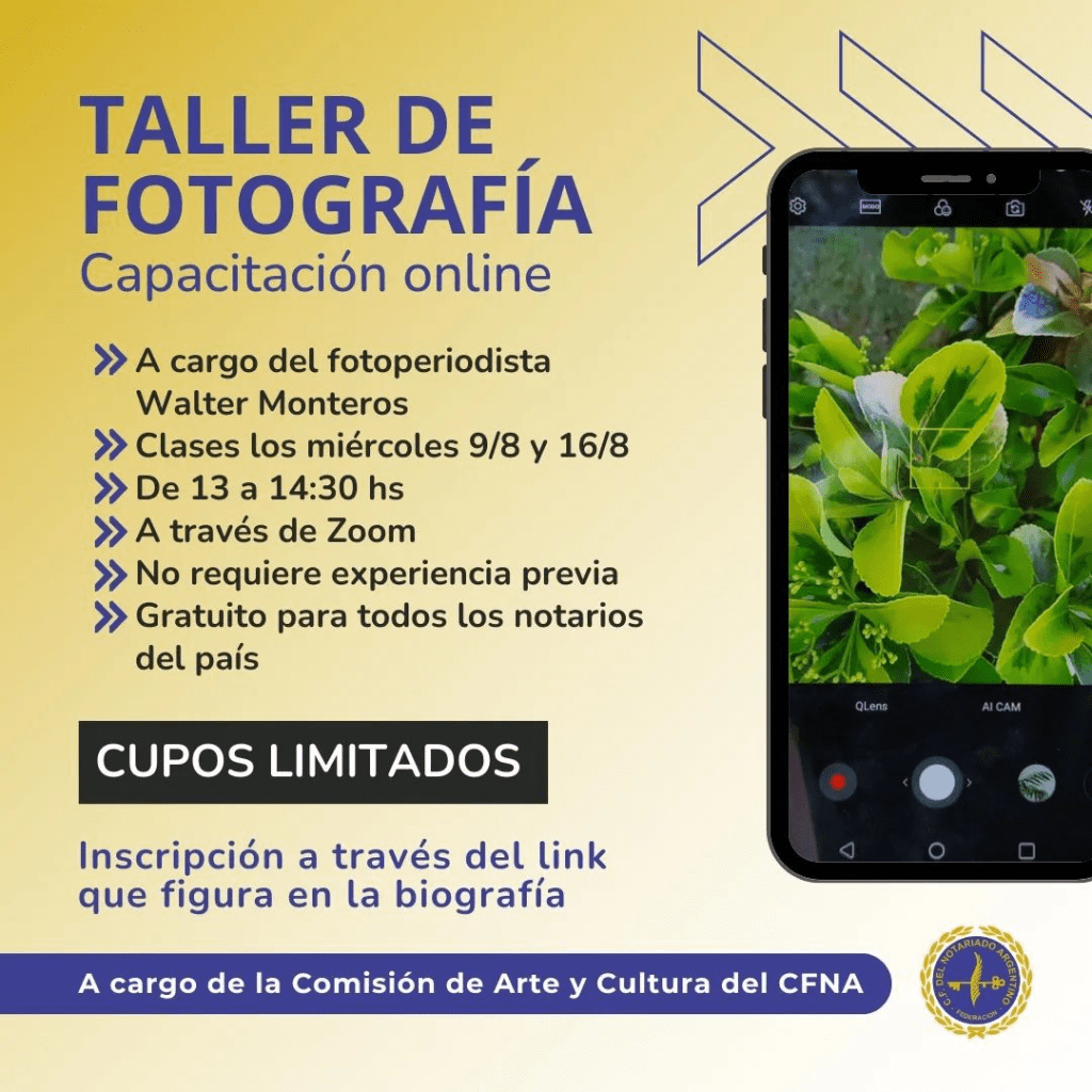 Invitamos a todos los escribanos/as del país a participar del Taller de Fotografía a cargo de la Comisión de Arte y Cultura del CFNA.