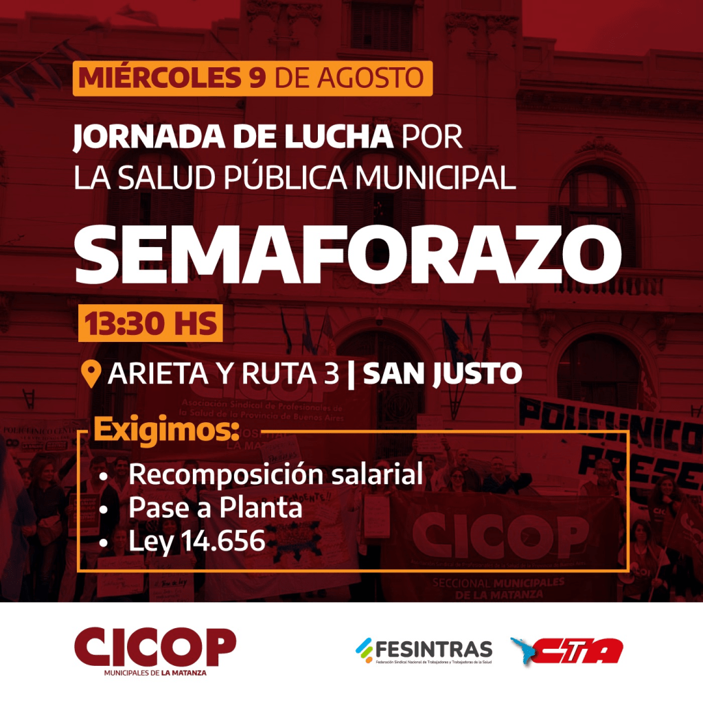 La Seccional CICOP Municipales de La Matanza acompaña y convoca al Semaforazo acordado en Asambleas que tendrá lugar el día miércoles 9 de agosto a las 13.30 hs en la intersección de Arieta y Ruta 3, San Justo.