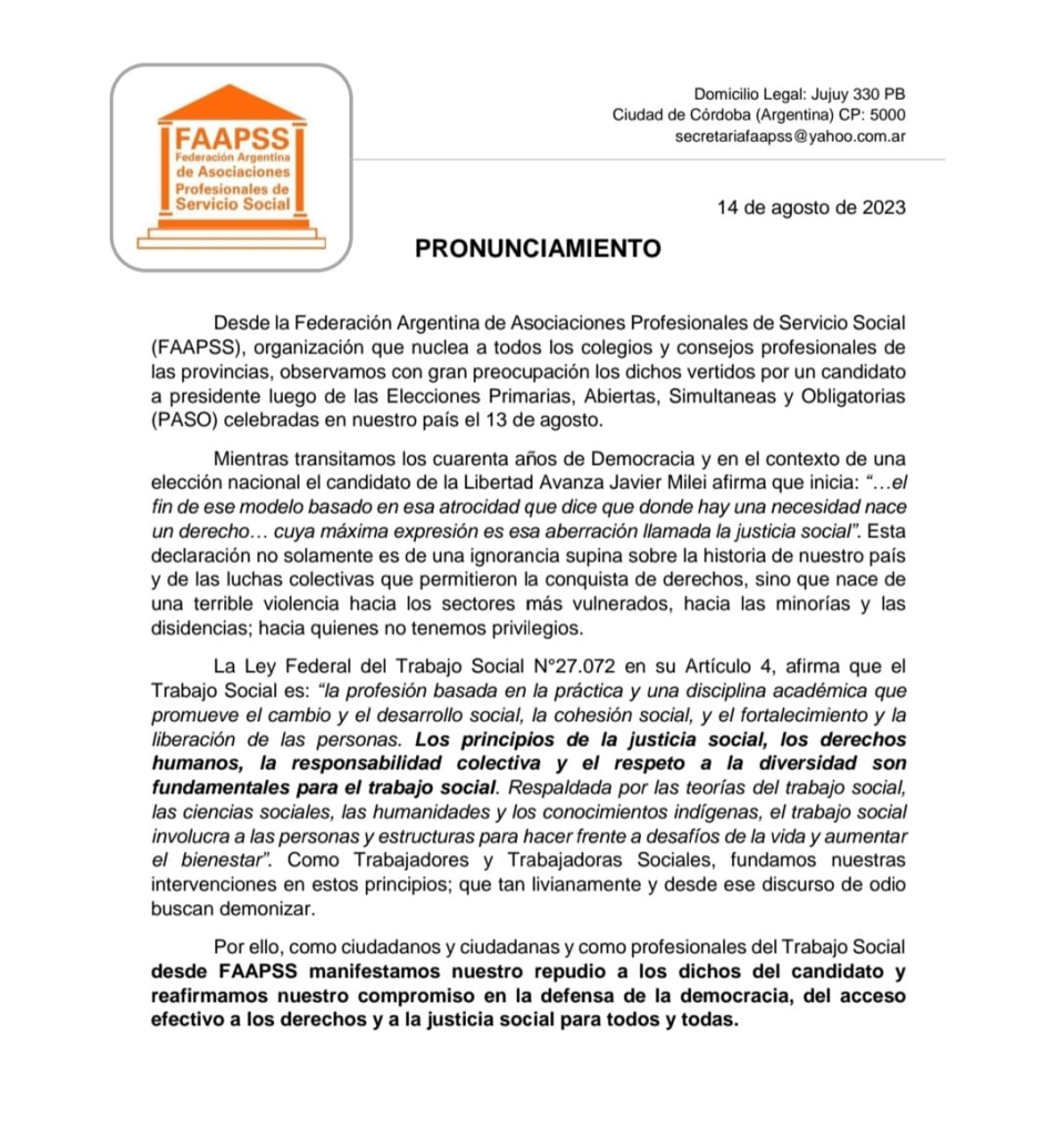 15 agosto, 202315 agosto, 2023 clipurbanodenoticias La FAAPSS expresó preocupación por los dichos de Milei y manifestó su «compromiso en defensa de la democracia» /Fuente: Federación Argentina de Asociaciones Profesionales de Servicio Social/ Comparte esto: Compartir en X (Se abre en una ventana nueva) X Comparte en Facebook (Se abre en una ventana nueva) Facebook Más Compartir en LinkedIn (Se abre en una ventana nueva) LinkedIn Compartir en Tumblr (Se abre en una ventana nueva) Tumblr Haz clic en Pinterest (Se abre en una ventana nueva) Pinterest Compartir en Telegram (Se abre en una ventana nueva) Telegram Compartir en WhatsApp (Se abre en una ventana nueva) WhatsApp Me gusta Cargando...