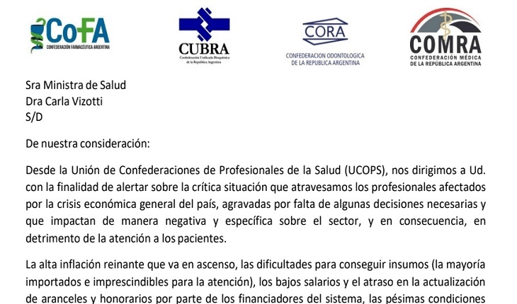 Desde la Unión de Confederaciones de Profesionales de la Salud (UCOPS), nos dirigimos a Ud. con la finalidad de alertar sobre la crítica situación que atravesamos los profesionales afectados por la crisis económica general del país, agravadas por falta de algunas decisiones necesarias y que impactan de manera negativa y específica sobre el sector, y en consecuencia, en detrimento de la atención a los pacientes.