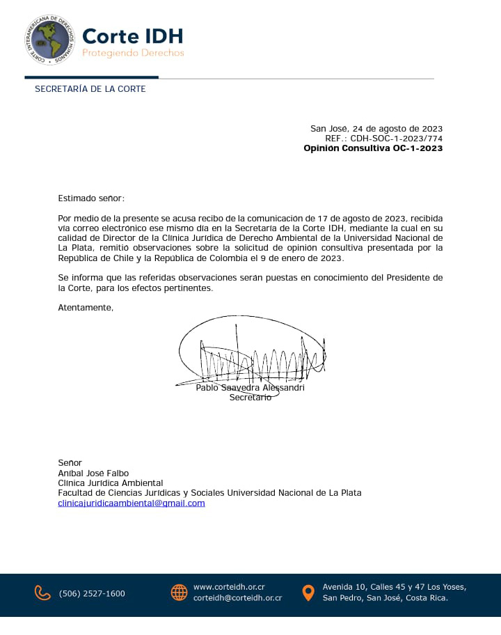 En ese contexto, desde la Secretaría de dicho organismo invitó a la Clínica Jurídica de Derecho Ambiental dirigida por el Profesor Anibal Falbo a participar en la elaboración de un documento (paper) que contenga la opinión escrita sobre el tema de las obligaciones estatales de preservar el derecho a la vida y la sobrevivencia frente a la emergencia climática a la luz de los derechos humanos. Dicho documento ya fue remitido a la Corte IDH.