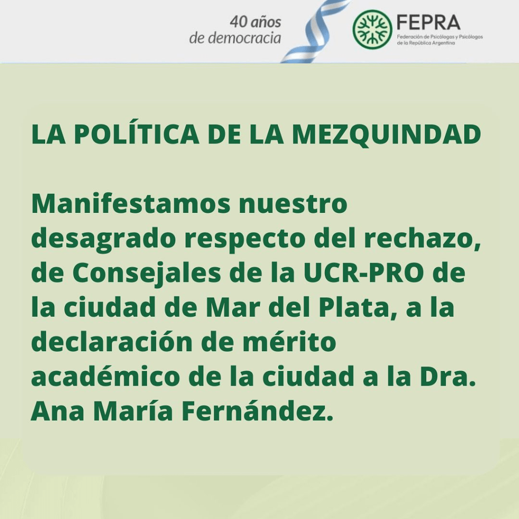 La Fepra manifiesta su desagrado respecto del rechazo, de Consejales de la UCR-PRO de la ciudad de Mar del Plata, a la declaración de mérito académico de la ciudad a la Dra. Ana María Fernández.