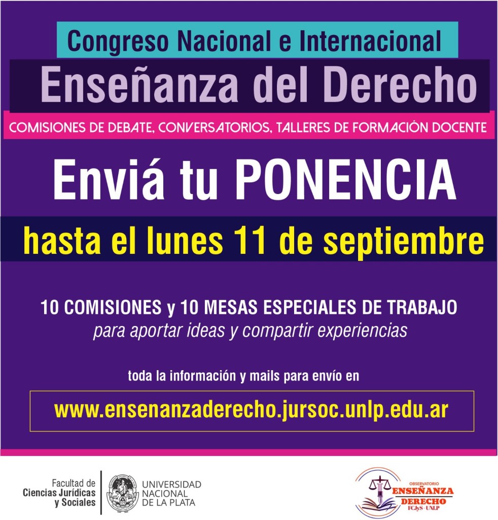 Los días 5 y 6 de Octubre se desarrollará en nuestra Facultad de Ciencias Jurídicas y Sociales de la UNLP el VI° Congreso Internacional de Enseñanza del Derecho, con 10 Comisiones de Debate y 10 Mesas Especiales de Trabajo, para las que estamos recibiendo Ponencias.