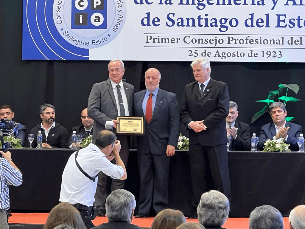 El Consejo Profesional de la Ingeniería y Afines de Santiago del Estero celebró este fin de semana de agosto el centésimo aniversario de su creación, siendo nuestra Federación invitada de lujo a tal evento. En una sala colmada de profesionales, autoridades e invitados, entregamos una placa conmemorativa de manos de nuestro presidente Ingeniero Alejandro Kane.