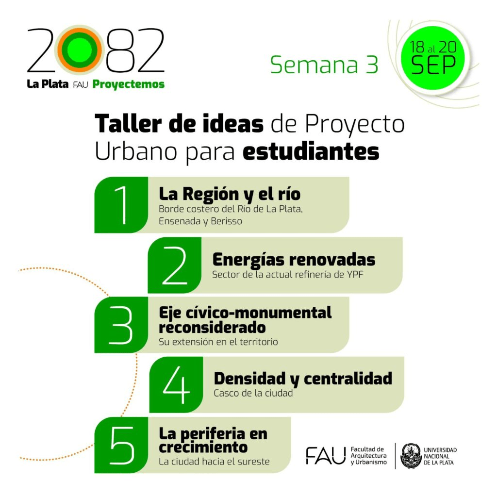 En el marco de los 70 años de enseñanza de la Arquitectura y los 60 años de la creación de la Facultad, se lleva a cabo esta propuesta que tiene como objetivo construir una mirada múltiple sobre los diversos temas que atraviesan a la ciudad de La Plata con perspectiva al año 2082, el bicentenario de la Capital de la provincia de Buenos Aires.