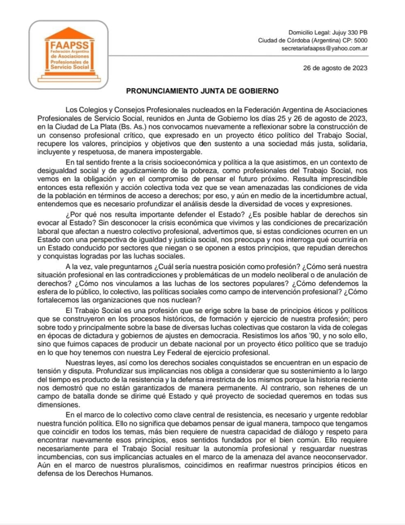 Pronunciamiento de la Junta de Gobierno de la Federación Argentina de Asociaciones Profesionales de Servicio Social.