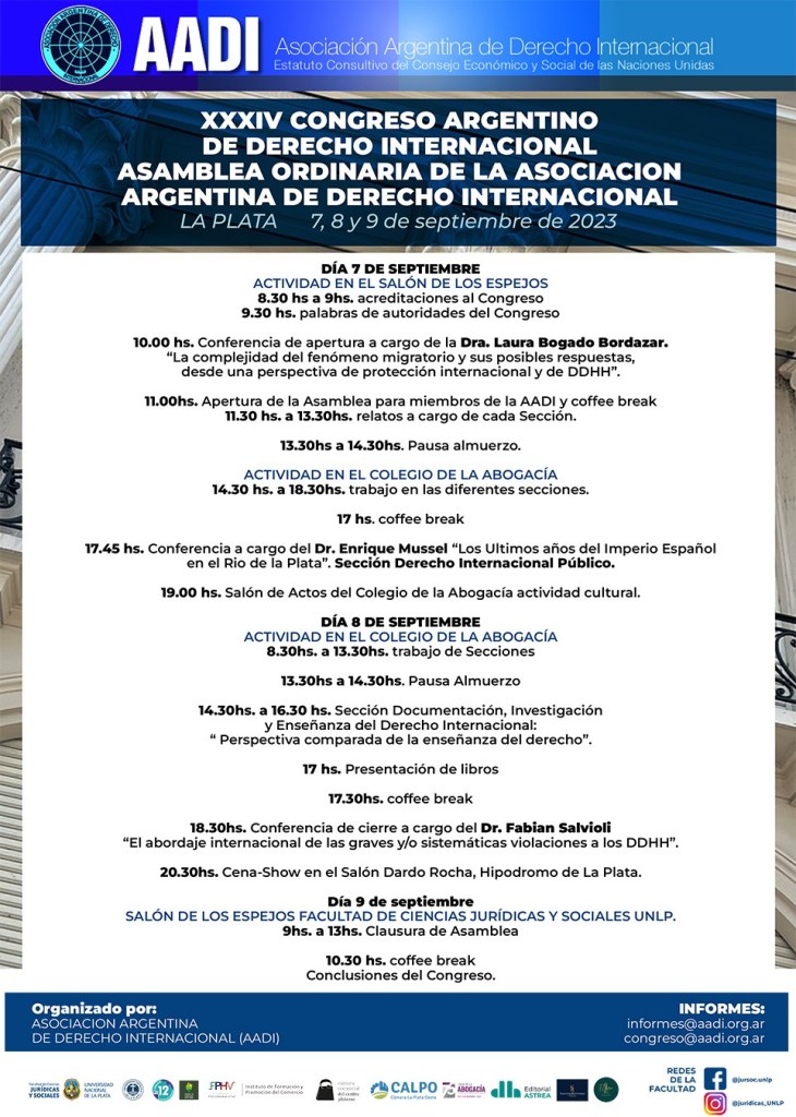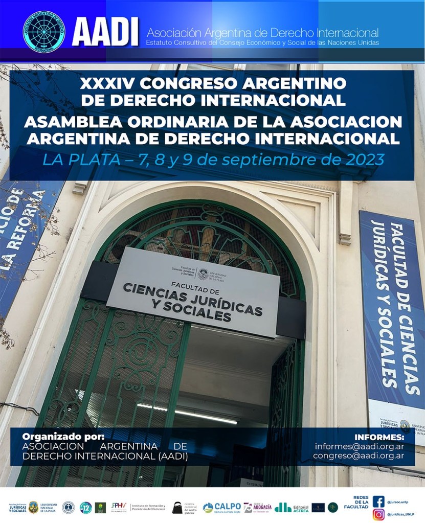 La Secretaría de Extensión invita a participar del «XXXIV Congreso Argentino de Derecho Internacional. Asamblea ordinaria de la Asociación Argentina de Derecho Internacional», el cual se llevará a cabo los días 7, 8 y 9 de septiembre del corriente año.