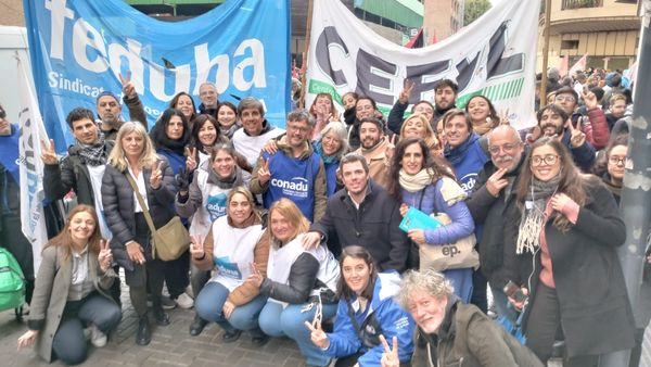 Junto con organizaciones de derechos humanos y partidos políticos, integrantes de la Mesa Ejecutiva de CONADU y de distintos gremios de base se manifestaron ayer para repudiar el acto negacionista que la candidata a vicepresidenta Victoria Villarruel convocó en la Legislatura porteña para «homenajear a las víctimas del terrorismo».