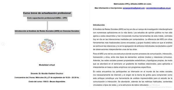 Desde Sociología Ar ASRA y Cpsociología Caba estamos ofreciendo un Curso breve de actualización profesional en el marco del Ciclo capacitación profesional ASRA – CPS: Introducción al Análisis de Redes Sociales (ARS) en Ciencias Sociales. Serán dos sesiones a cargo del Dr. Nicolás Chuchco (Doctor en Ciencias Sociales – UBA), y experto en ARS. ¡Todos invitados!